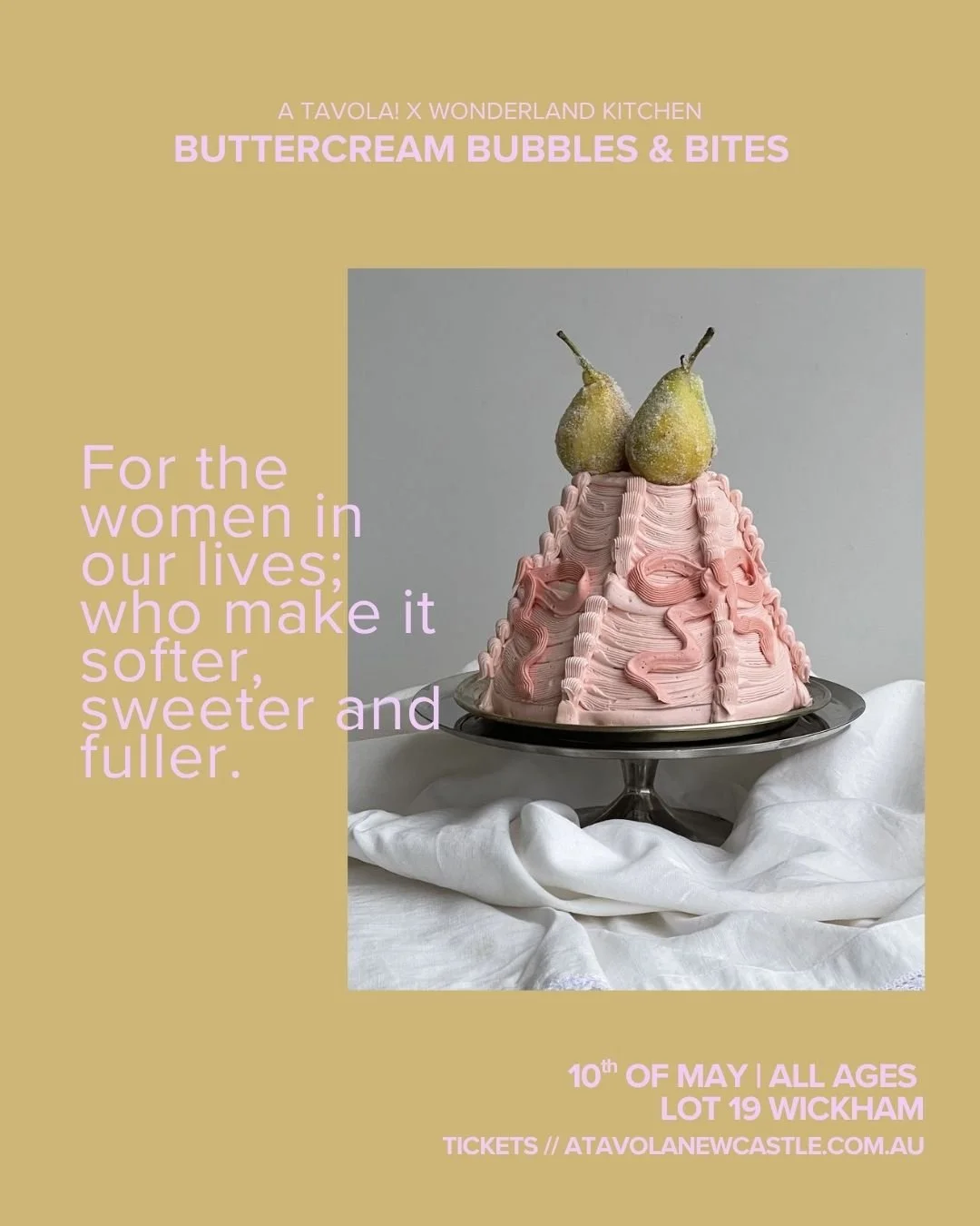 Events SATURDAY 9TH MAY | BUTTERCREAM BUBBLES & BITES | A TAVOLA x WONDERLAND KITCHEN ADULT TICKET Click Here SUNDAY 10TH OF MAY | BUTTERCREAM BUBBLES & BITES | A TAVOLA x WONDERLAND KITCHEN CHILD TICKET Click Here SUNDAY 10TH OF MAY | BUTTERCREAM BUBBLES & BITES | A TAVOLA x WONDERLAND KITCHEN ADULT TICKET Click Here